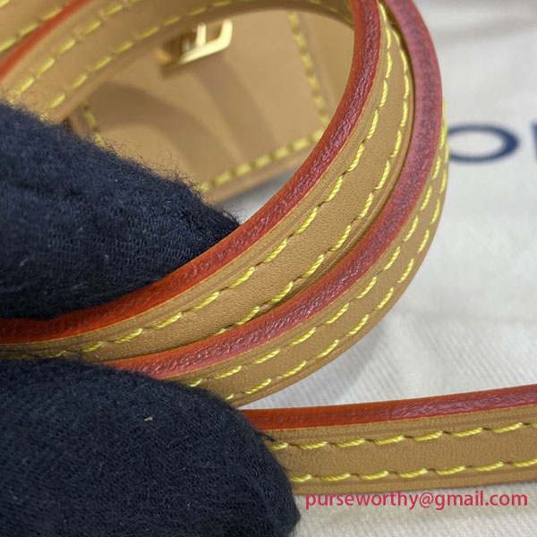 A miniature interpretation of the iconic Noé bag, the Noé purse appeared on the runway at Louis Vuitton's Fall-Winter 2020 fashion show. This version is crafted from Monogram canvas with natural leather details, including a luggage tag and a removable strap.