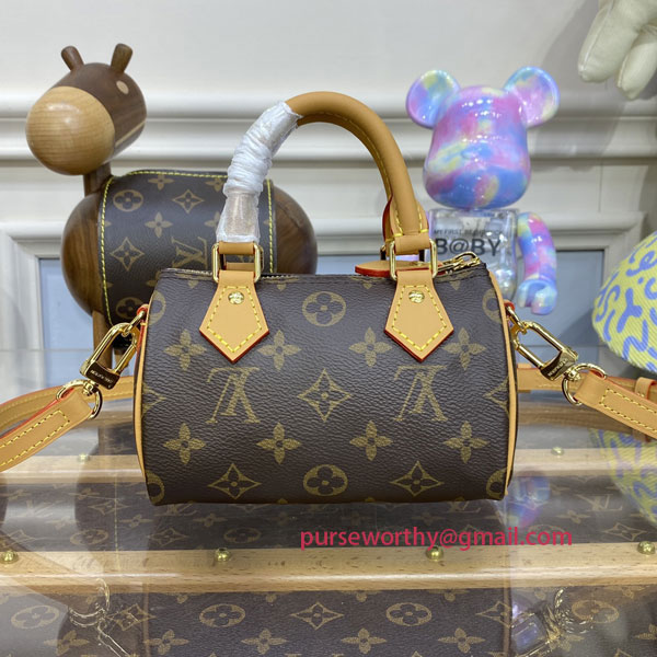 The Nano Speedy revamped in Monogram canvas is the perfect miniature version of Louis Vuitton's iconic Speedy bag, and the ideal way to carry essentials. This beautifully crafted design is complemented by aged natural cowhide leather and gold-tone hardware. In addition to its two handles, it has a removable, adjustable shoulder strap for different carry options.