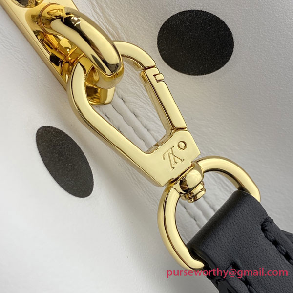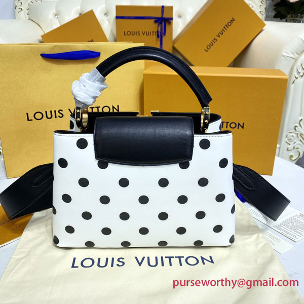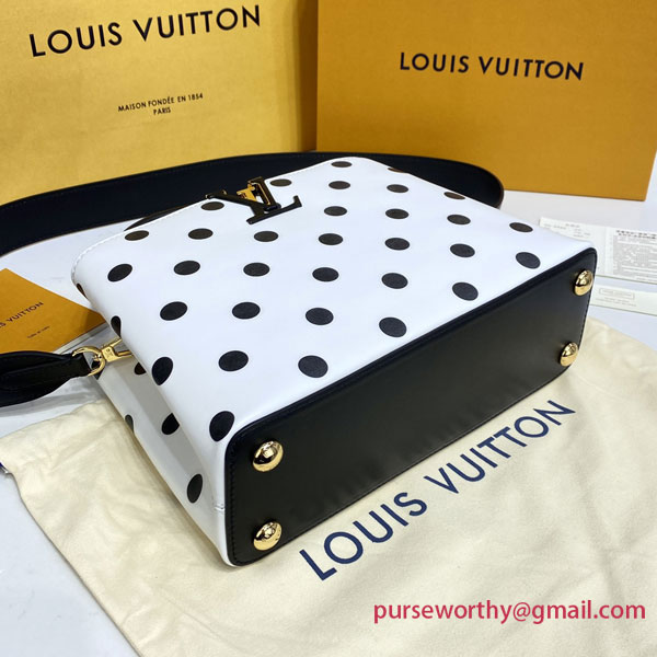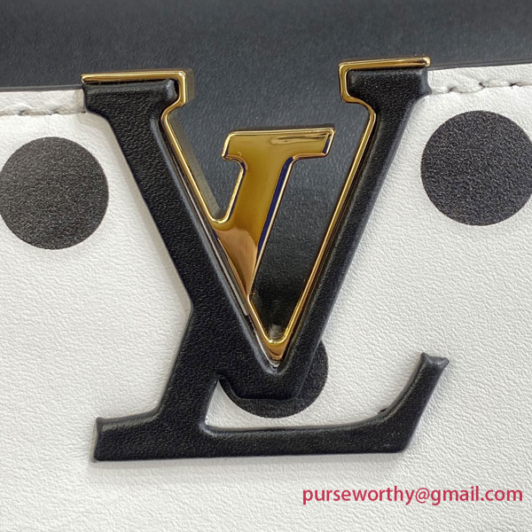 Inspired by the Spring-Summer 2022 Ready-to-Wear Collection’s exploration of this strong classic print, the Capucines BB bag is revamped in white calfskin with a graphic pattern of black polka dots. The wide removable strap and top handle allow all the carries: hand, elbow, on the shoulder and cross-body.