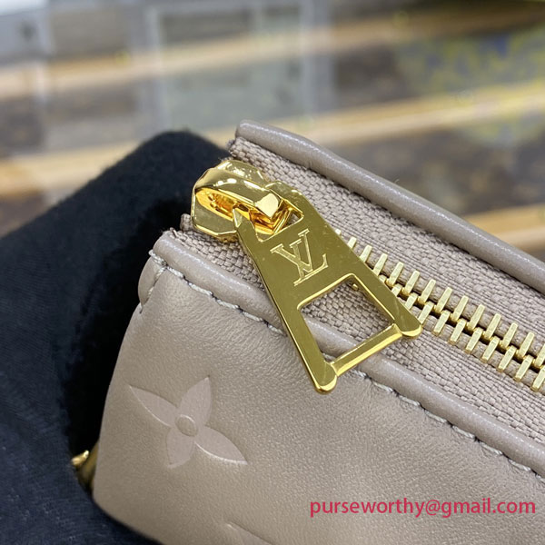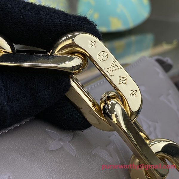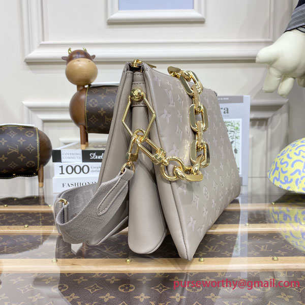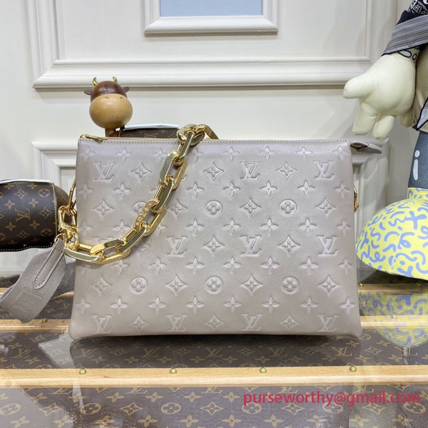 This season, the body-friendly and ultra-comfy Coussin MM handbag is made from Monogram-embossed puffy lambskin in a timeless grey hue with gold-color hardware. A wide textile strap enables comfortable all-day cross-body wear while the removable chunky chain allows under-arm and baguette carry. Inside, the Coussin features three separate compartments.