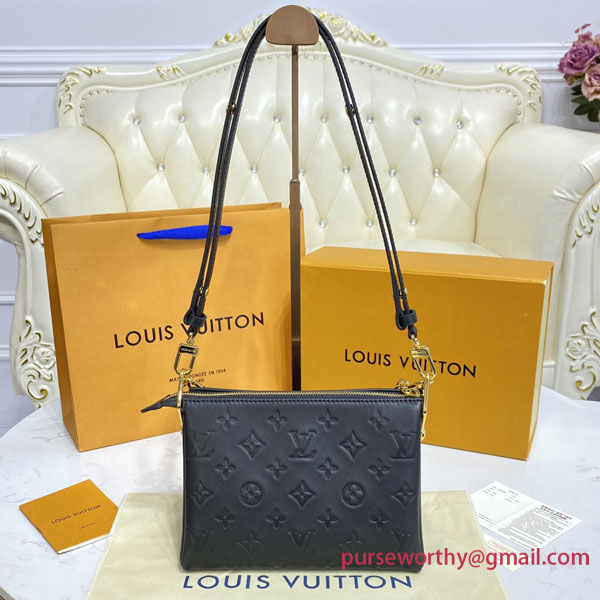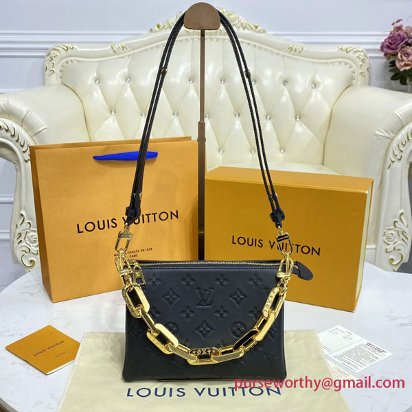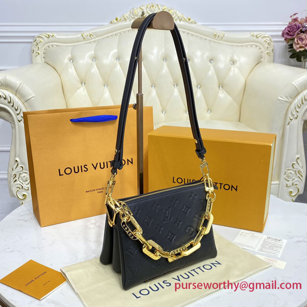The super soft and cushiony Coussin BB is an adorably compact handbag, fashioned from puffy lambskin embossed with the Monogram pattern. A chunky gold-color chain and a thin leather strap, both removable, enable different attitudes and carry options. Two inside compartments add practicality, making this an ideal day-to-evening accessory.