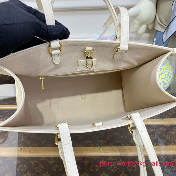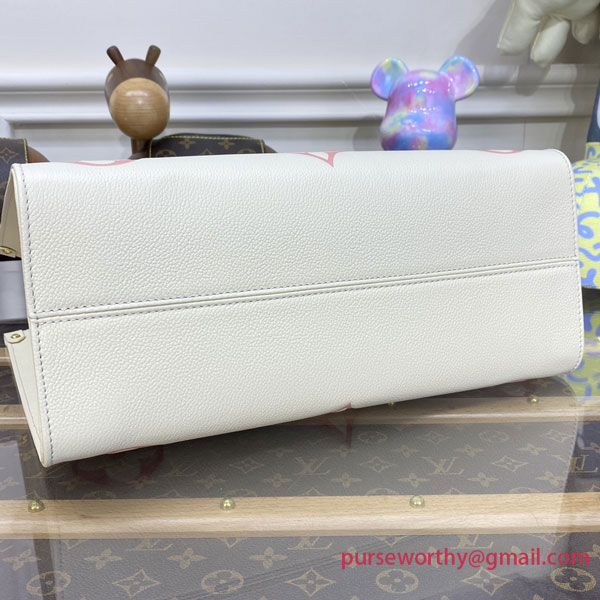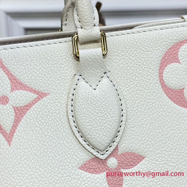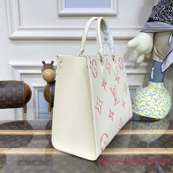 Offered in a springlike bicolor version, this elegant OnTheGo MM tote lends a fresh touch to the season’s silhouettes. Embossed Monogram Empreinte leather elevates this roomy, practical carryall, as useful for a day in town as for a day of business appointments. The bag’s top handles and long straps allow for a range of styling options.