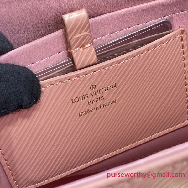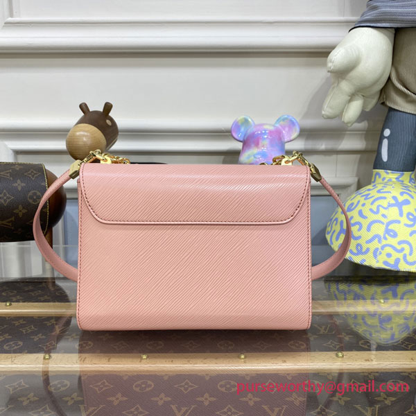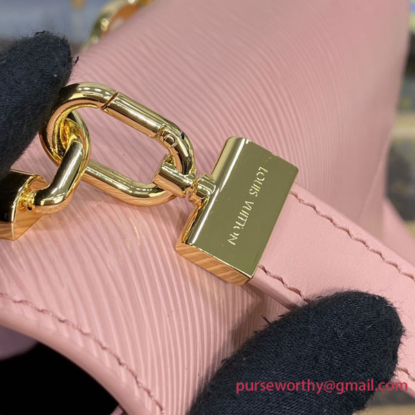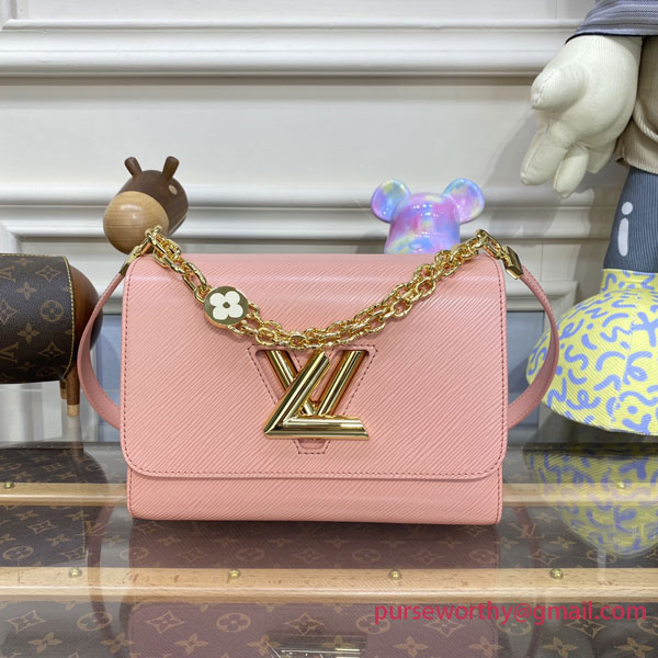 Signed with a double chain adorned with an enamel Monogram Flower, this Twist MM handbag is made from grained Epi leather with smooth-leather trim and lining. The chain can be used as a decorative accessory or attached to the shoulder strap for mulitple carrying options.