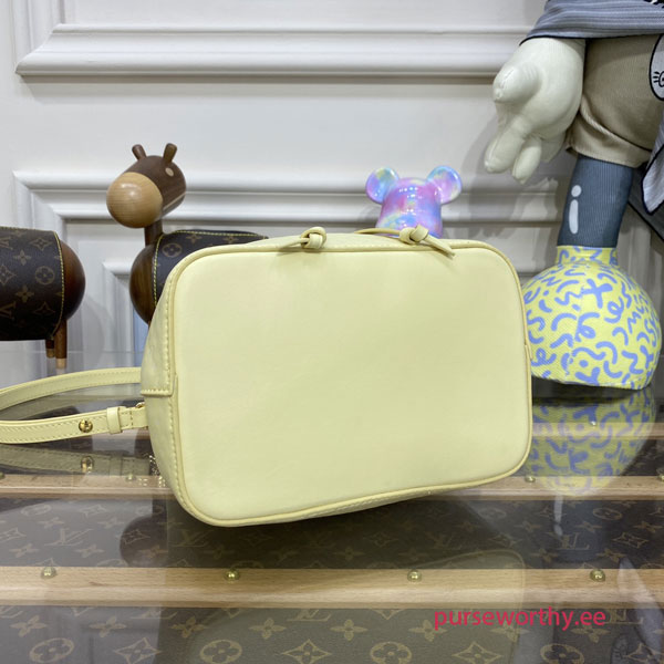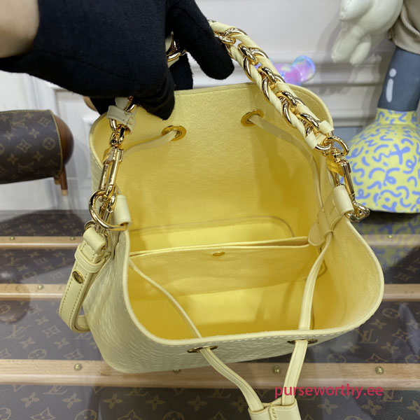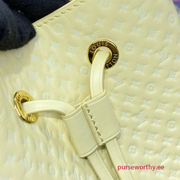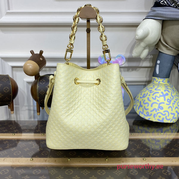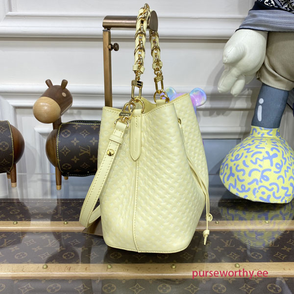 The NeoNoé BB bucket bag is made from supple calfskin leather embossed with the Nano Monogram pattern; the tiny LVs and Monogram Flowers printed in a delicately contrasting tone. The color of the leather braiding on the detachable chain and the leather on the shoulder strap match that of the bag.