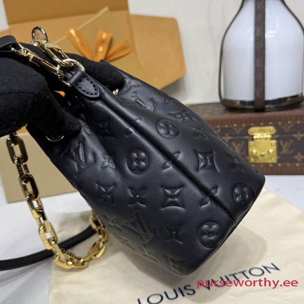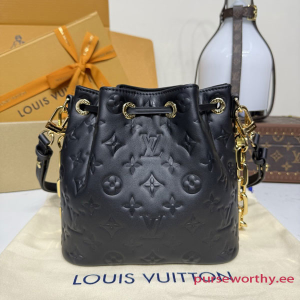 Introducing the latest edition to the Coussin family, the Bucket handbag offered in sophisticated Monogram-embossed lambskin. A feminine day-to-evening option, it is adorned with gold-toned hardware, including a signature LV padlock and a removable Coussin chain. The drawstring closure is both functional and stylish, and complements the bag’s multiple carry options.