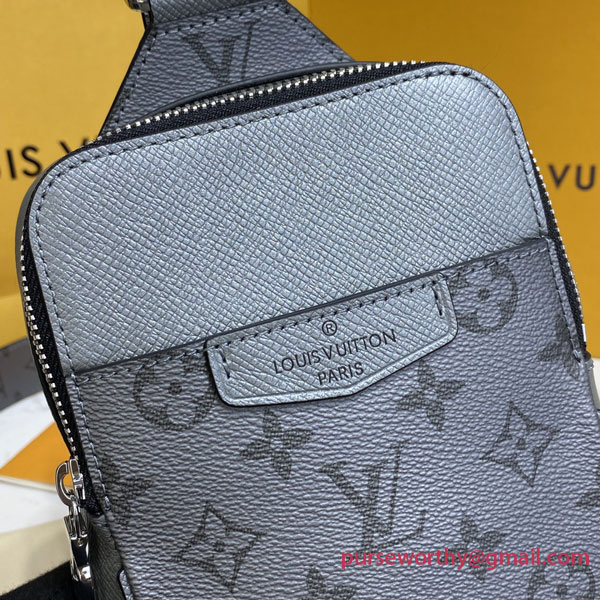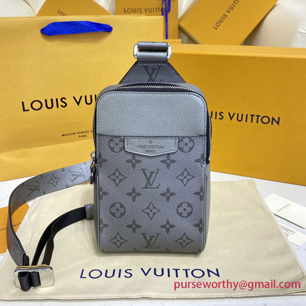 This Outdoor Sling bag is made from tone-on-tone Taiga leather and Monogram canvas as part of the Taigarama collectsion. Just the right size for essentials such as a phone, keys, earbuds, and credit cards, this sling bag has a shoulder strap that adjusts for left or right carry.