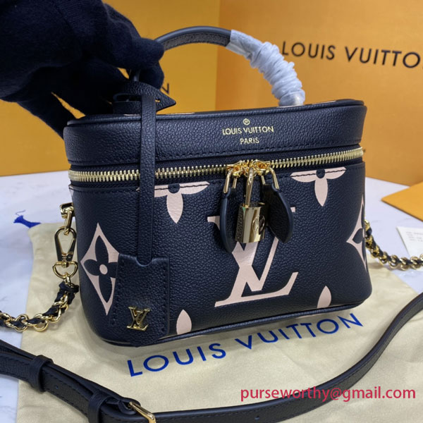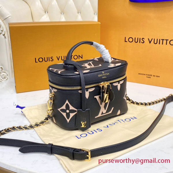 Inspired by the Monogram Nice Vanity, the Vanity PM handbag in Monogram Empreinte leather is a fashionably small bag with a distinctive shape. It is made from grained leather, embossed with the Giant Monogram motif. Its tassel zip pulls, ladylike top handle, and removable strap make it versatile and strikingly stylish.