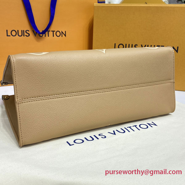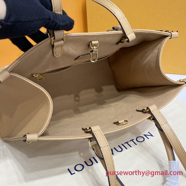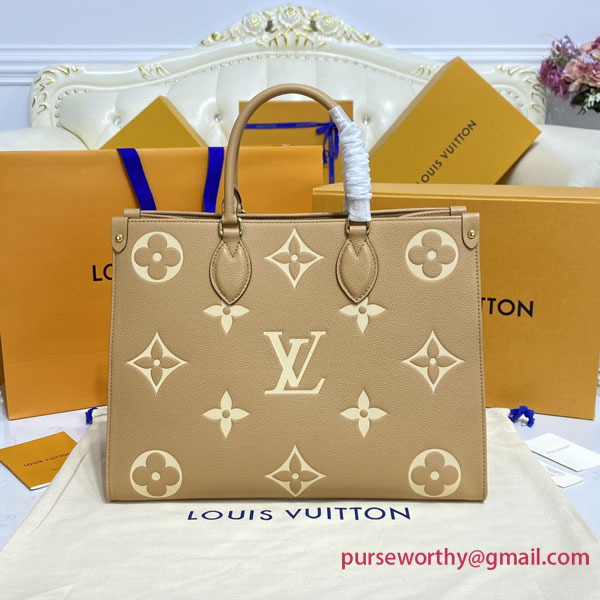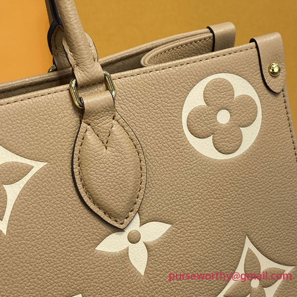 Made from Monogram Empreinte grained leather in a warm two-color combination, this OnTheGo MM tote bag features the Monogram pattern embossed and printed onto the leather. Its boxy shape means it’s roomy and can easily fit a laptop. It has two leather top handles for hand carry as well as two long shoulder straps.