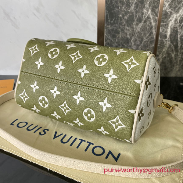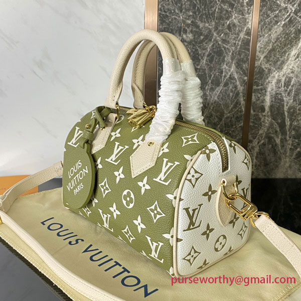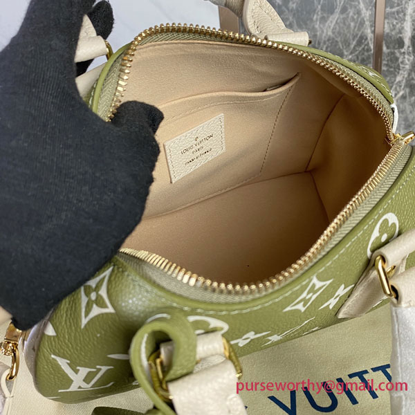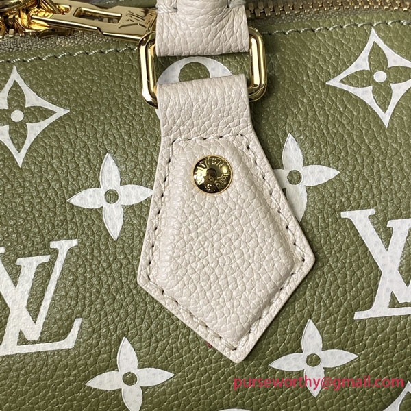 The Speedy Bandoulière 20 handbag looks amazing in Monogram Empreinte leather with the pattern embossed then printed on the cowhide. The distinctive design and rolled-leather top handles are clearly inspired by the House’s travel legacy. The bag’s sides are in a contrasting colored leather. It’s signed with a leather Louis Vuitton Paris name tag.