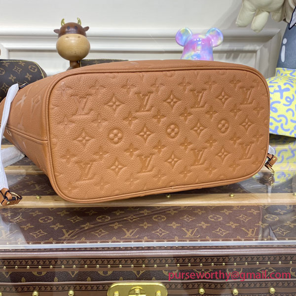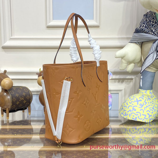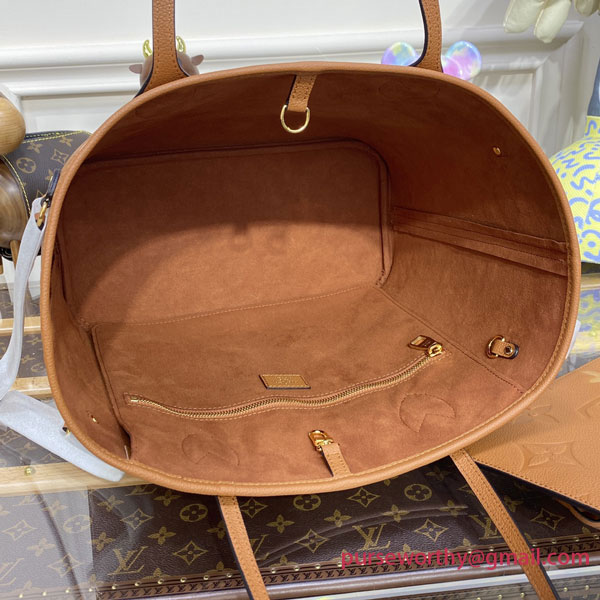 With this Neverfull MM carryall in Cognac Brown cowhide leather, Louis Vuitton brings a new, natural aspect to a flawless classic. Embossed into the supple leather, the Monogram Flowers and LV Initials give the bag an understated charm. The leather handles slip comfortably over the shoulder or arm. Inside is a removable matching zipped pouch.