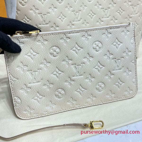 The Summer Stardust animation brings a shimmering effect to the embossed Monogram Empreinte leather of this Neverfull MM carryall. Roomy but lightweight, its side laces cinch for a sleeker allure or loosen for a more casual feel. The leather handles slip comfortably over the shoulder or arm.