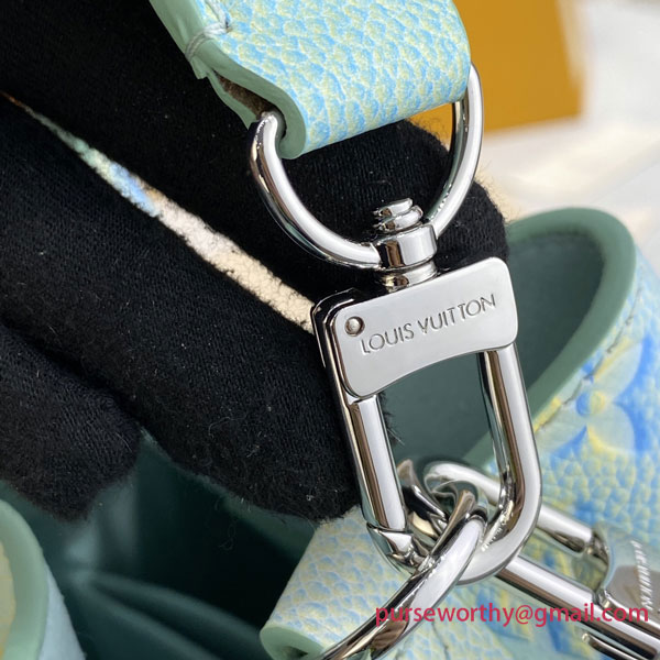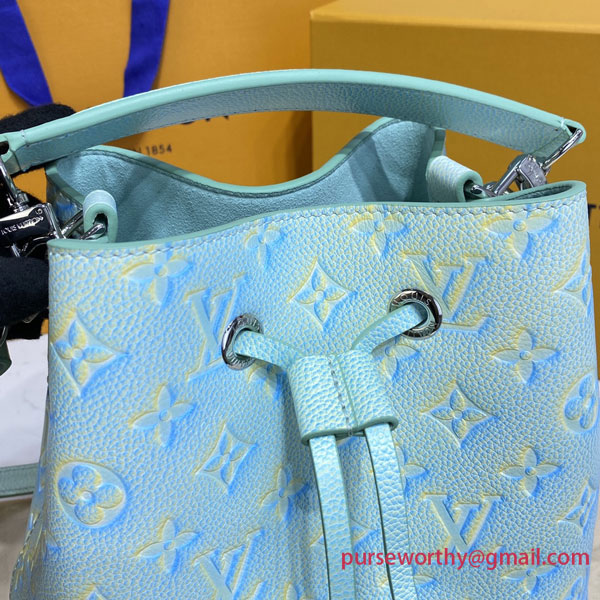 The adorable NeoNoé BB bucket bag is fashioned from the Summer Stardust version of Monogram Empreinte leather, a three-step spraying process giving the leather a shimmering aspect. A removable top handle and detachable strap provide carry options. The bag closes with a drawstring while the inside central pocket closes with a press stud.