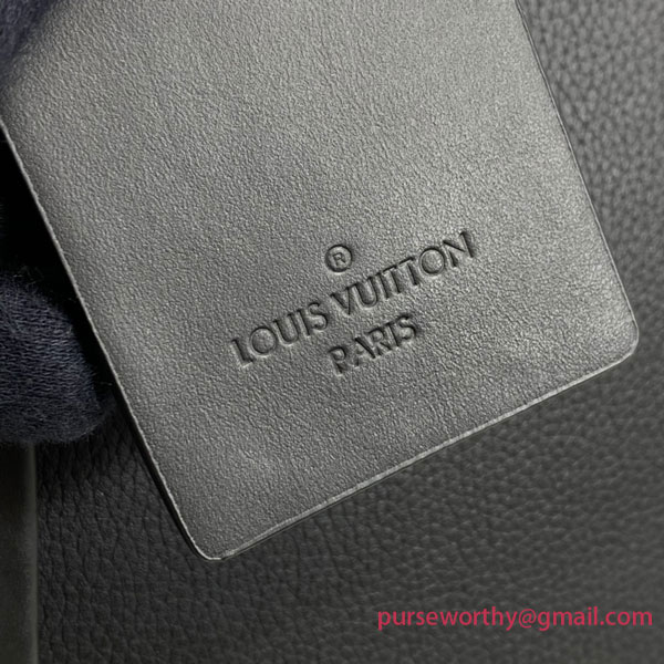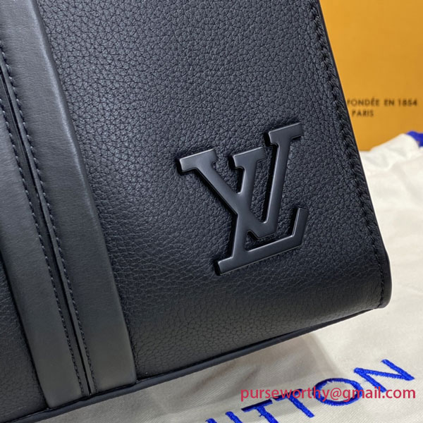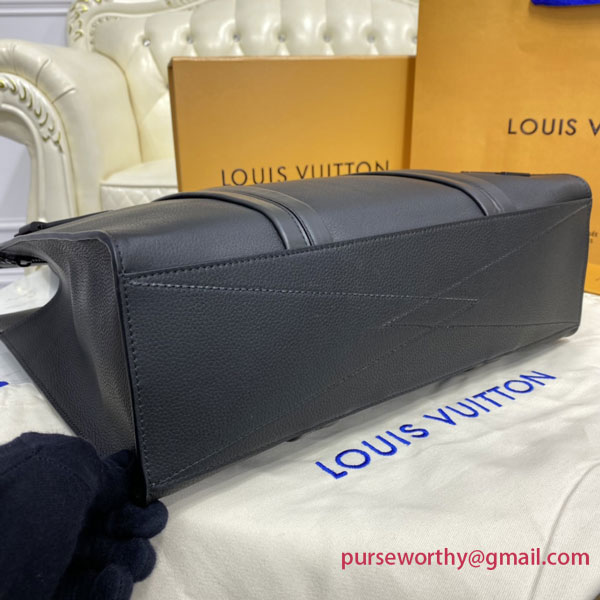 Styled in soft, finely grained black calf leather, the LV Aerogram Takeoff Tote is a practical and elegant outsized bag. Its minimalist design is sure to appeal to the fashion-conscious man who appreciates subtle signature touches like the leather tag and LV initials in black metal. And it has a lockable compartment to keep a laptop and other valuables secure.