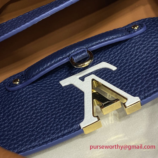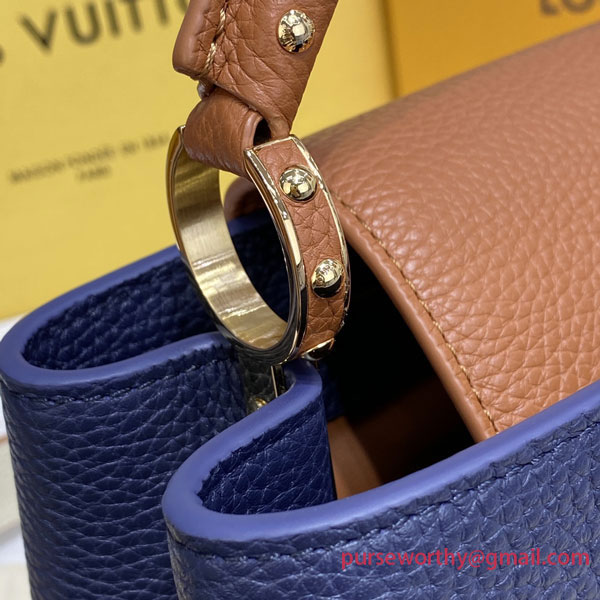 The adorable Capucines BB bag is made from Taurillon leather in an elegant dark blue that is enhanced by a warm caramel tone on the flap, handle and strap. The crafted leather strap and emblematic top handle are studded with rivets, like those used on Louis Vuitton’s historic trunks.