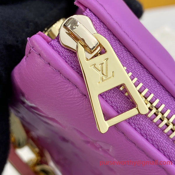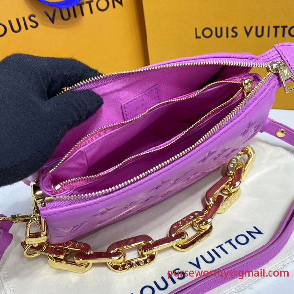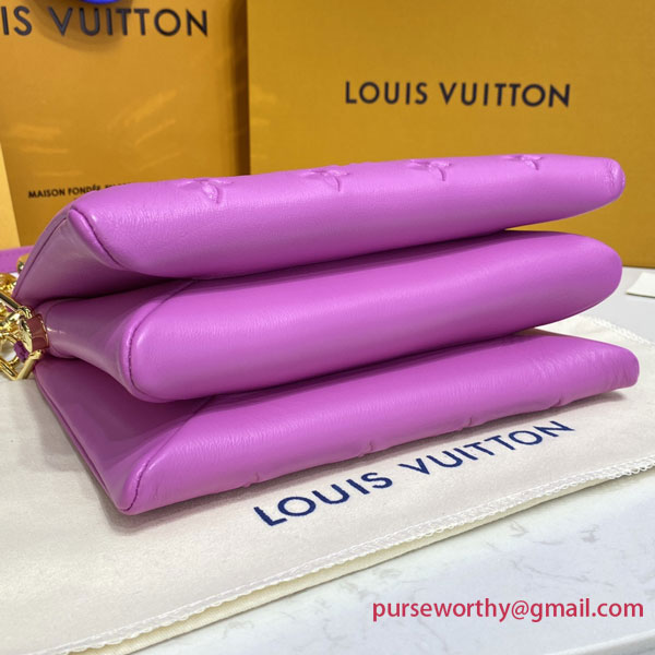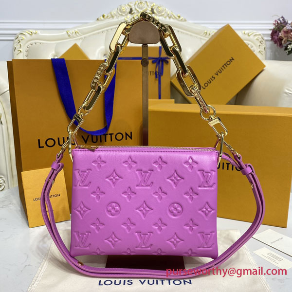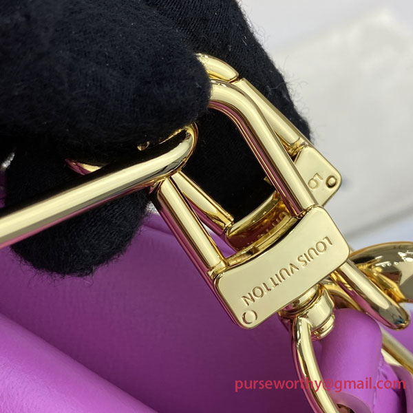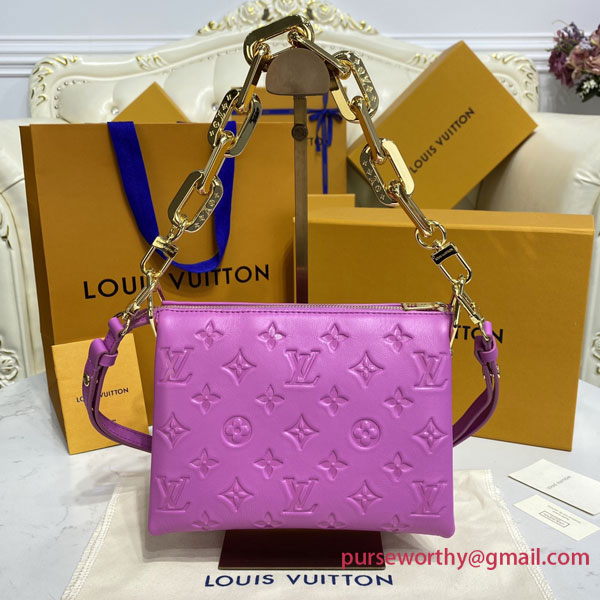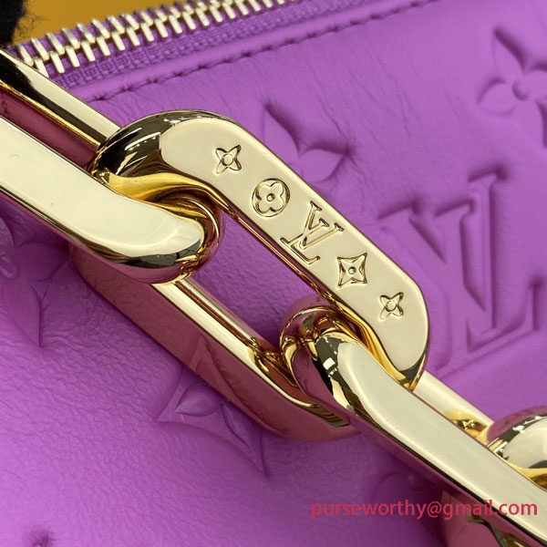 The compact Coussin BB handbag is made from Monogram-embossed puffy lambskin and features a thin removable leather strap as well as a detachable, short chunky chain with translucent resin ornamentations. Body-friendly thanks to its soft foamed lambskin, the bag is a pleasure to carry. Versatile, this little bag is the perfect day-to-evening companion.