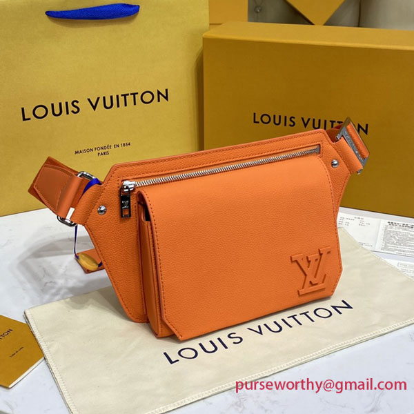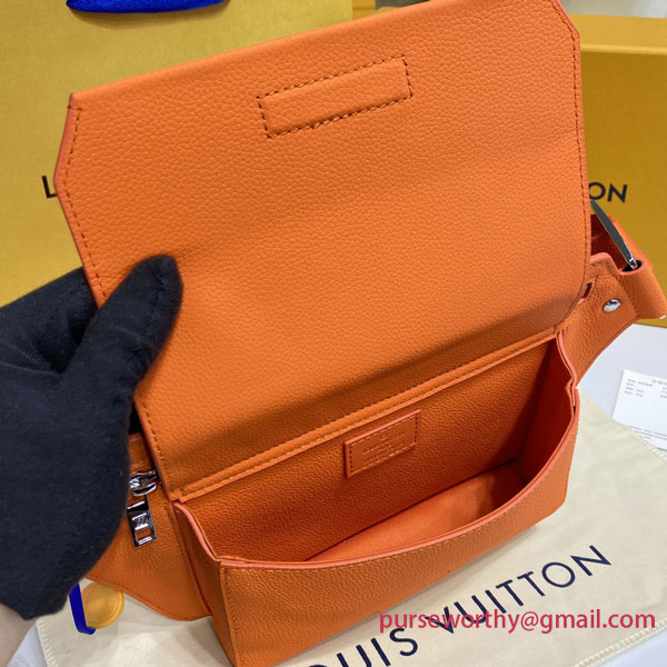 Its spare design and rich grained calf leather make the LV Aerogram Takeoff Sling a practical hands-free accessory for the fashion-conscious man. The “LV” initials in orange metal and a strap inspired by the House’s historic trunks add a subtle signature touch. The spacious main compartment, with its beveled flap and magnetic closure, is supplemented by a secure zipped pocket.