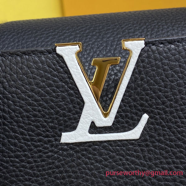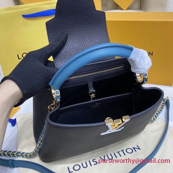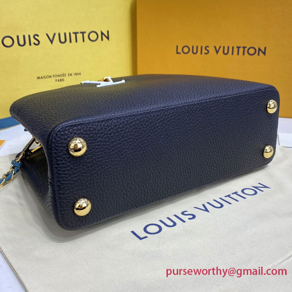 The stylish Capucines BB bag looks stunning in Taurillon leather with a crafted gold-colour chain braided with leather. The chain is part of a detachable and adjustable strap that allows the bag to be carried on the shoulder or cross-body. The Capucines can be worn with its flap out or tucked inside the bag to feature the iconic LV Initials.