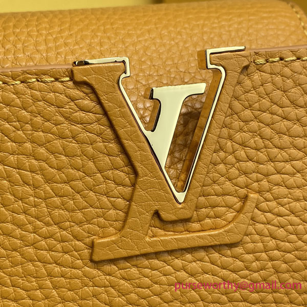 The precious Capucines Mini bag in Sunbeam Yellow Taurillon leather takes on added charm thanks to its sophisticated chain. Leather is braided into the gold-colour links, giving a feeling of craftsmanship. The chain is part of a detachable and adjustable strap that allows the bag to be carried on the shoulder or cross-body. The bag can be worn two ways: flap outside or inside to display the signature LV Initials, here partially covered in leather.