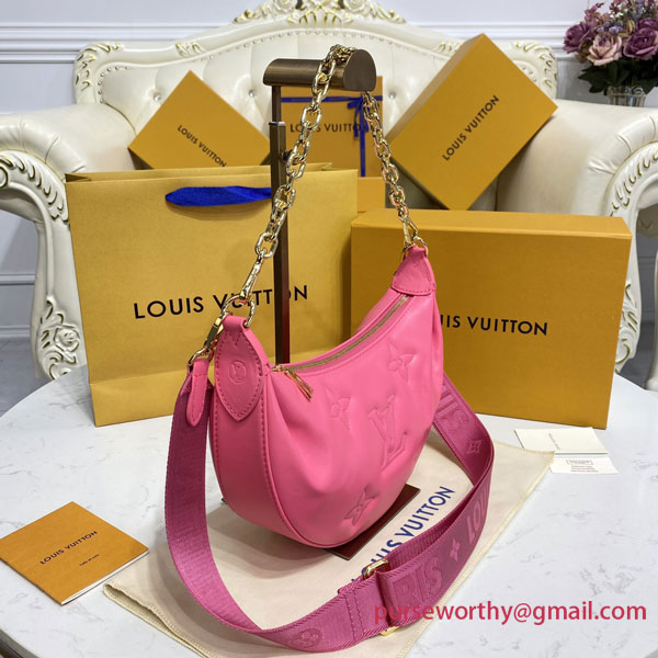 The Over The Moon delights with its versatile shape in quilted calf leather. The embroidered puffy Monogram pattern brings a statutory feel while the adjustable strap and gold-color chain deliver a myriad of carry options: elbow, short shoulder, cross-body, and long shoulder. With the strap removed, it can even be carried as an evening clutch.