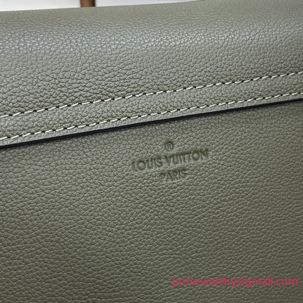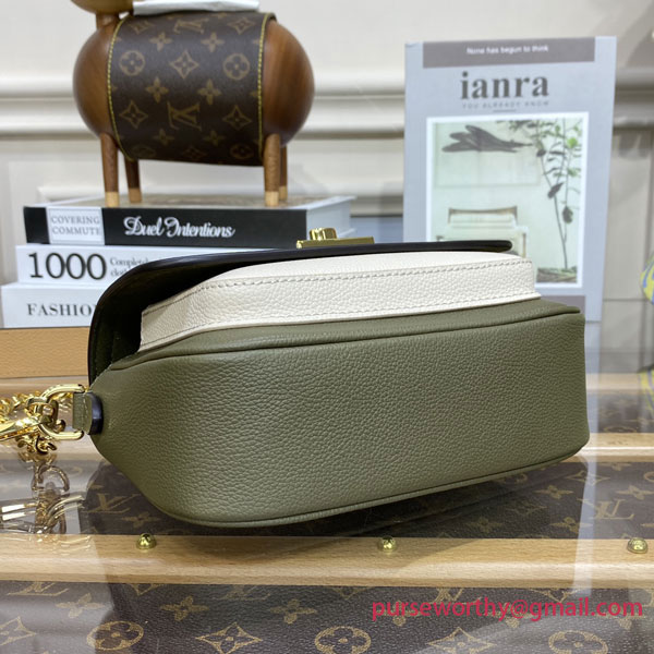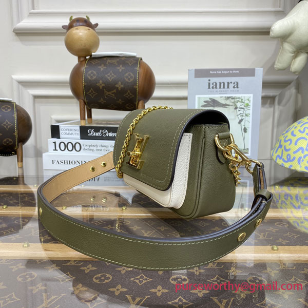 The Lockme Tender cross-body bag seems to radiates style in light khaki-green grained calf leather with luminous quartz-white calf leather on the front pocket under the flap. It boasts a wide removable and adjustable strap in addition to its traditional gold-color chain. A small D-ring on the strap enables it to be customized with a charm.