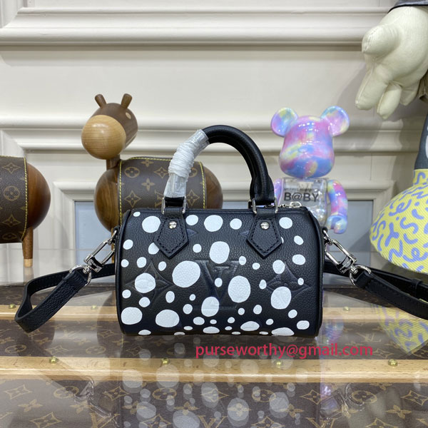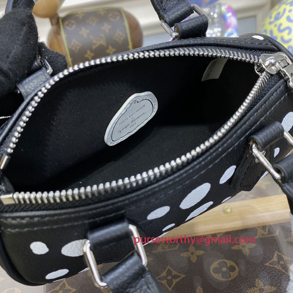 The LVxYK Nano Speedy joins the “Infinity Dots” theme as part of the new Louis Vuitton x Yayoi Kusama collaboration. The revered Japanese artist’s work is characterized by repetitive dotted patterns, evoking the infinite nature of time. For this mini-version of the Speedy, dazzling white dots are printed on black cowhide embossed with the House’s signature Monogram pattern. An elegant clutch becomes an ode to art and craftsmanship.