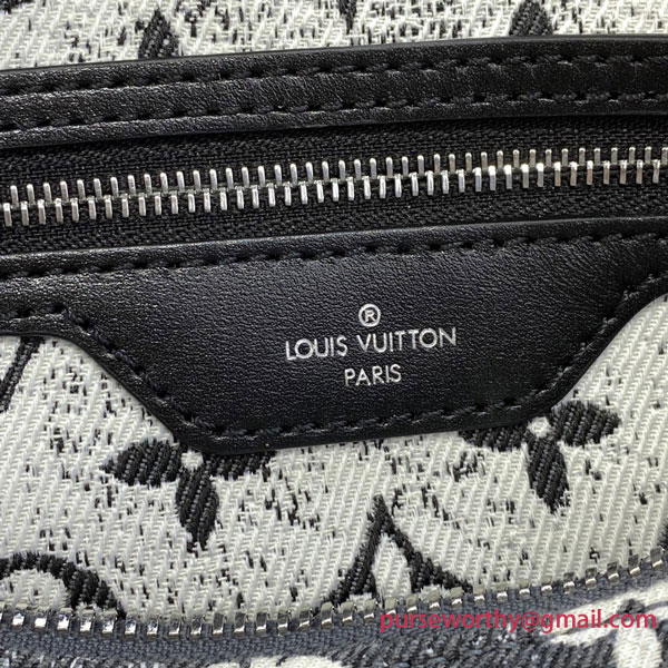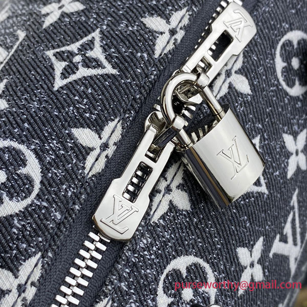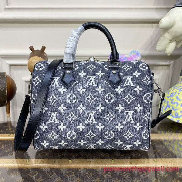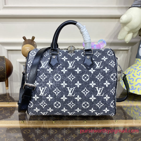 The iconic Speedy Bandoulière 25 handbag wears a new version of the Monogram pattern, unveiled at the Cruise 2023 show. Monogram Jacquard Denim is a gray, stone-washed effect canvas with a purposely raw aspect that contrasts creatively with the bag’s black leather trim and silver-finish hardware. The reverse jacquard lining adds a playful finishing touch.