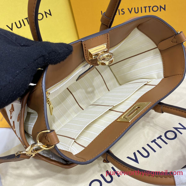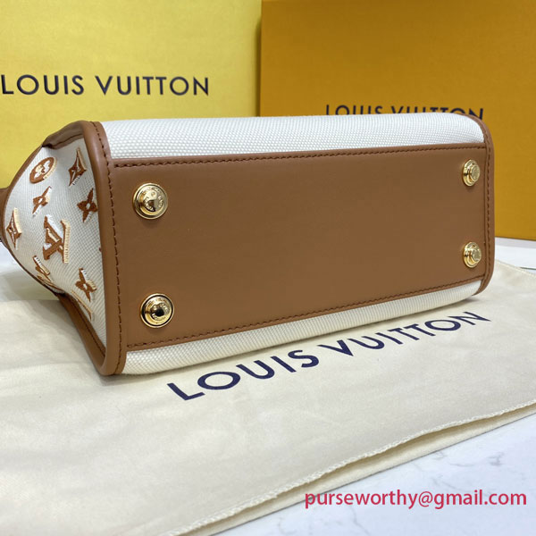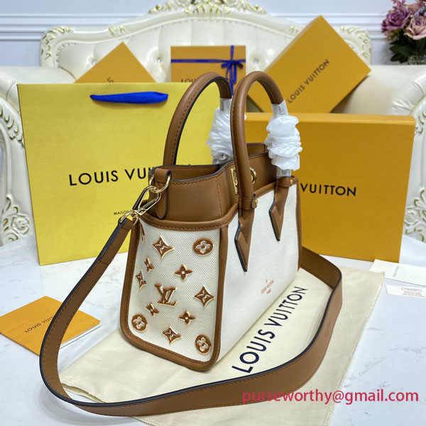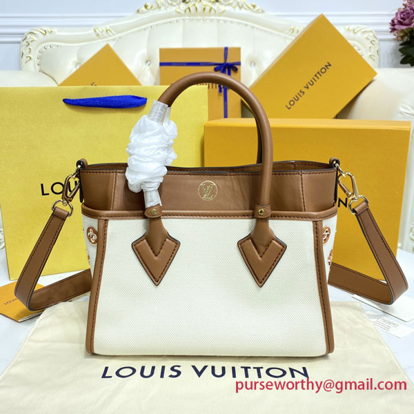 A summery edition of the On My Side PM with this compact tote bag made from canvas with smooth leather around the top and rolled-leather top handles. The design features Monogram Flower tufting on the bag’s sides to higlight the signature style of the bag and a removable strap for comfortable cross-body wear. Two outside pockets give quick access to essentials.