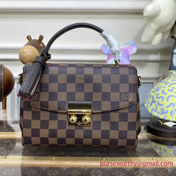 A compact bag with modern lines, the Croisette in Damier Ebene canvas boasts sophisticated details (note the signature S-lock) and a casual-chic allure. The removable leather tassel adds a touch of fun. Sized to fit the essentials plus a long wallet, this versatile piece can be hand-carried, slung over the shoulder or worn cross-body.