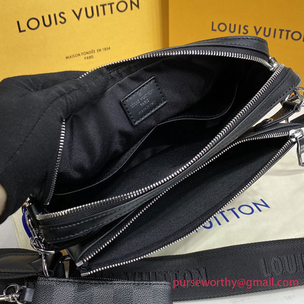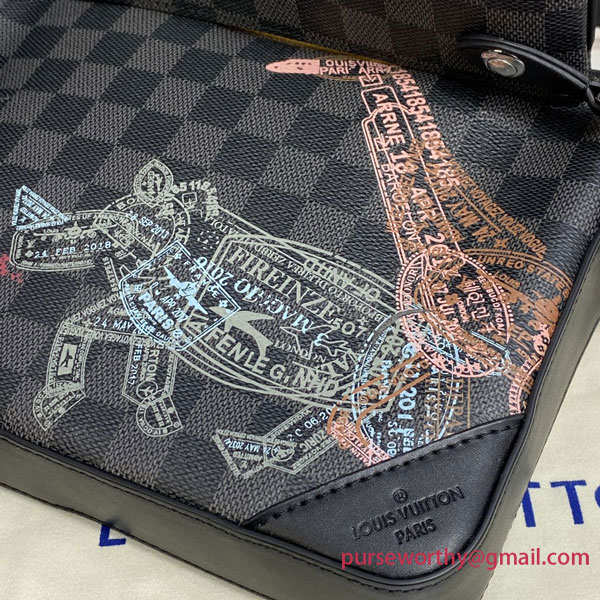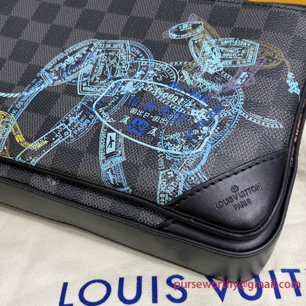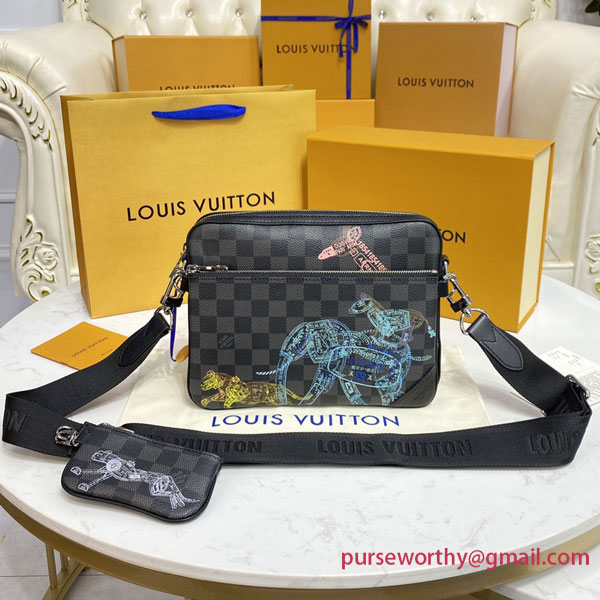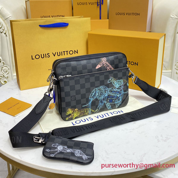 This Trio Messenger is made from Damier Graphite canvas twisted with a print of a herd of wild animals. Closer inspection divulges that the animals are made of passport-style stamps. The Trio is three bags in one: a roomy main compartment with a zipper, a detachable small pouch, and a coin purse attached to the adjustable strap.