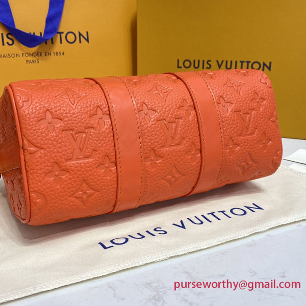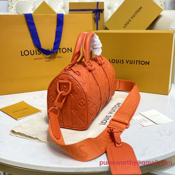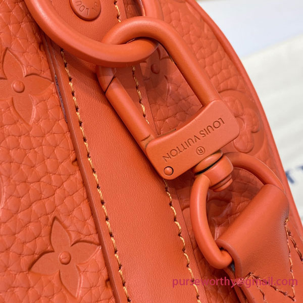 This new mini-version of Louis Vuitton’s famous Keepall bag is styled in sumptuous Taurillon Monogram leather dyed bright orange, one of designer Virgil Abloh’s signature colors. Its updated design integrates all the iconic Keepall details, like the dual reinforcement strips and leather name tag. With its double handle and removable strap, it’s a practical and eye-catching city bag.