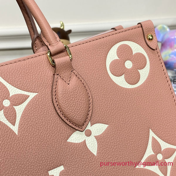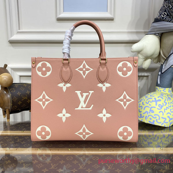 This OnTheGo MM tote bag is made from Monogram Enpreinte leather, with the Monogram Flowers and LVs in a cream color, embossed then printed on a pink background. Lined in a matching greige, this carryall is perfect for work or weekend. The OnTheGo offers both articulated top handles and long shoulder straps.