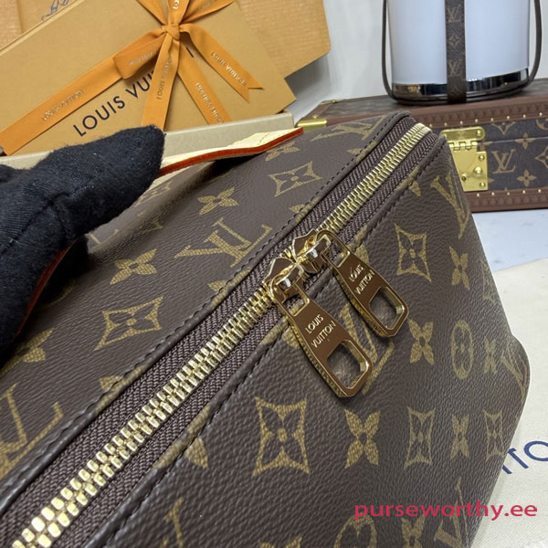 Made from Monogram coated canvas, the Toiletry Bag 2 Compartments pouch is a new travel essential. Thanks to its extra-large opening, and inner gussets, the pouch offers two distinct inside compartments, ideal for carrying grooming products. Very functional, it features double-zip closure and a washable textile lining. The top handle makes it easy to carry.