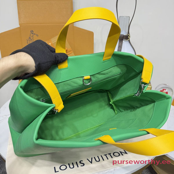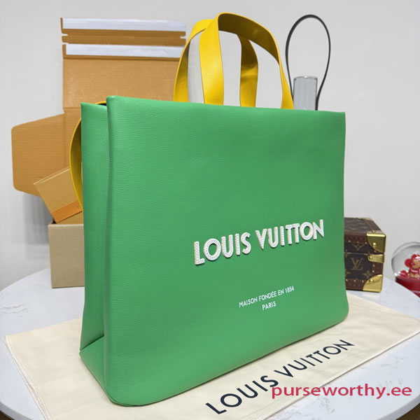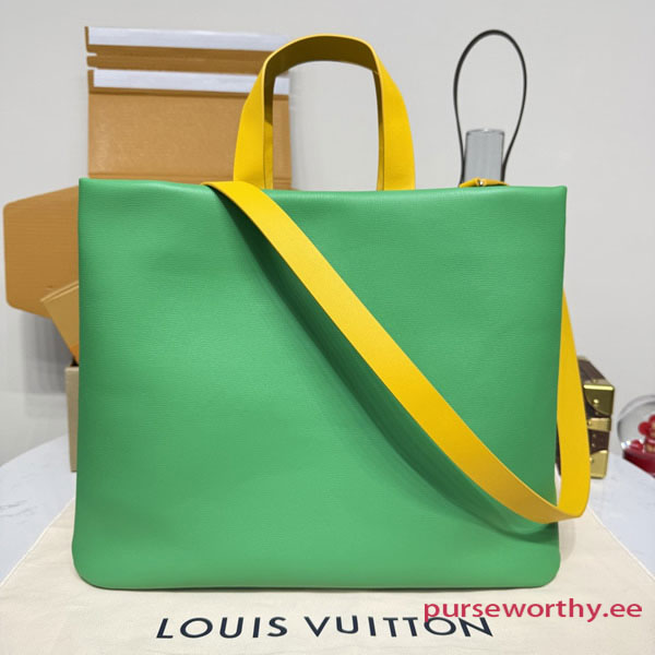 Part of the LV Packaging line elevating everyday objects into luxury pieces, the Shopper Tote ingeniously reimagines the Louis Vuitton shopping bag as a carryall bag in cowhide leather. It’s signed Louis Vuitton in a contrasting color and features tone-on-tone lining. Two top handles enable hard carry while a removable strap allows shoulder carry.