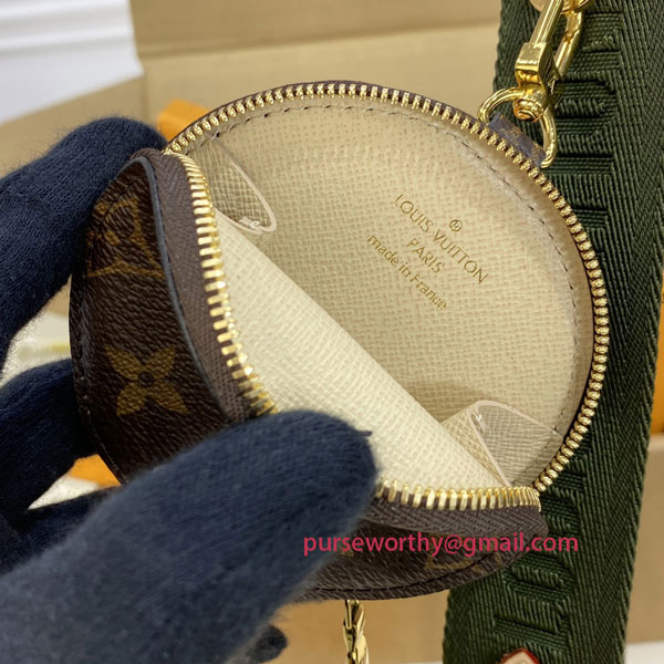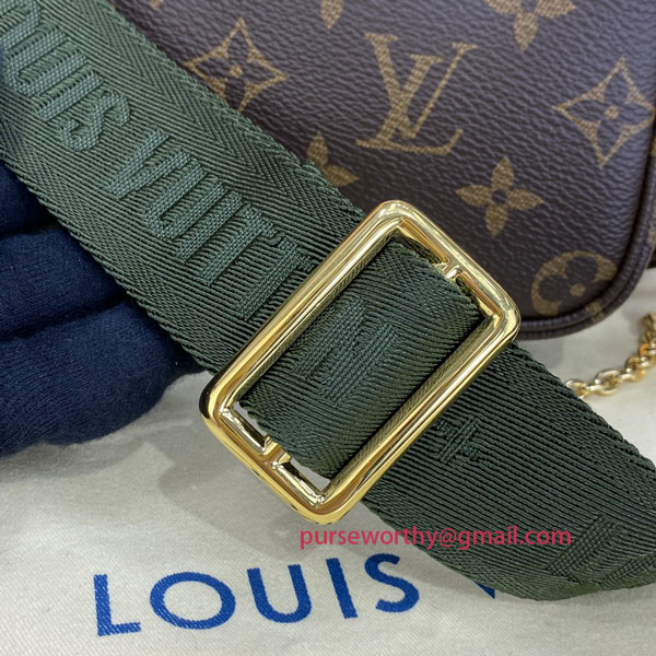 The Multi Pochette Accessoires is a hybrid cross-body bag with multiple pockets and compartments that brings together a Pochette Accessoires, a Mini Pochette Accessoires and a Round Coin Purse. Fashioned from Monogram canvas with a mini Monogram pattern on the sides of the two pochettes, it has both a removable gold-tone chain and an adjustable Louis Vuitton inscribed Jacquard strap for multiple carrying options.