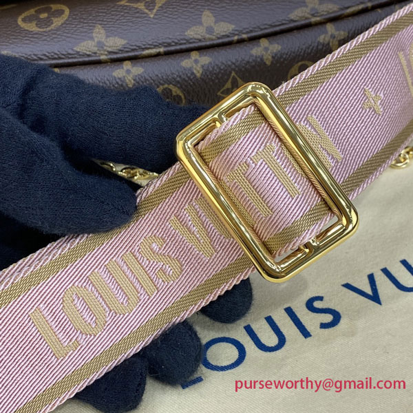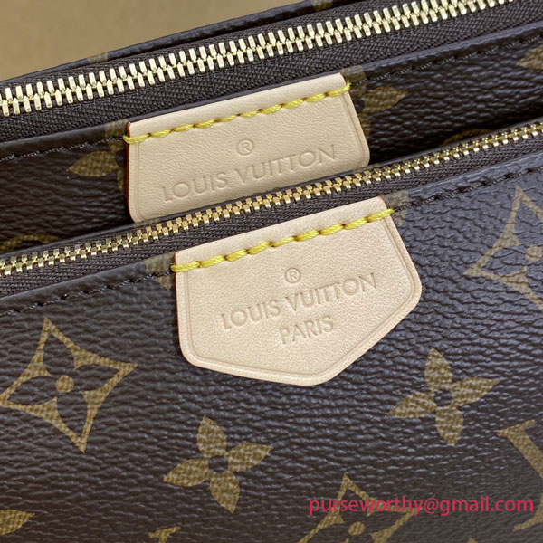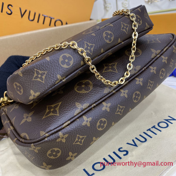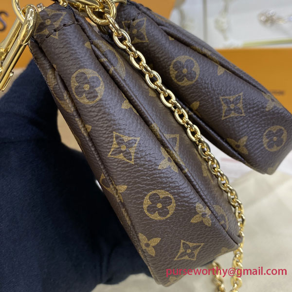 The Multi Pochette Accessoires is a hybrid cross-body bag with multiple pockets and compartments that brings together a Pochette Accessoires, a Mini Pochette Accessoires and a Round Coin Purse. Fashioned from Monogram canvas with a mini Monogram pattern on the sides of the two pochettes, it has both a removable gold-tone chain and an adjustable Louis Vuitton inscribed Jacquard strap for multiple carrying options.
