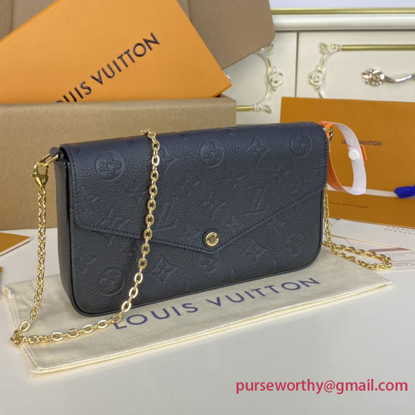 The Pochette Félicie is crafted from Monogram Empreinte leather, embossed with Louis Vuitton's signature Monogram pattern. Designed to adapt to modern lifestyles, this envelope-style pouch contains a spacious compartment with two removable pockets: one zipped, one with card slots. It can also be carried in different ways thanks to a removable gold-tone chain.