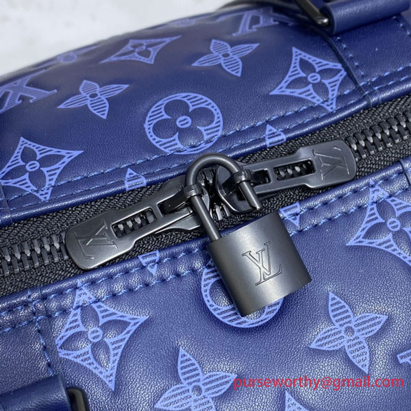 The iconic Keepall Bandoulière 50 weekend bag for men takes on a discreet charm in navy blue Monogram Shadow calfskin leather. The bag’s Monogram motif is printed in light blue and embossed in the leather. Surprisingly roomy for a carry-on, the Keepall 50 features a zipped inside pocket to keep important items safe.
