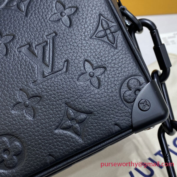 With its riveted corners and boxy shape, the Mini Soft Trunk bag in black Monogram-embossed Taurillon leather is a direct descendent of Louis Vuitton’s original trunks. The two matte-black chains, one connected to the zipper and the other serving as part of the shoulder strap, bring modernity to this small bag.