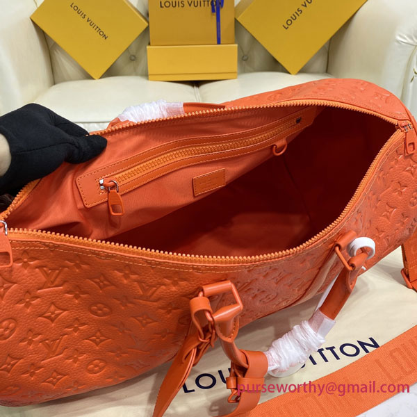 The famous Keepall now comes in a dazzling shade of orange, one of designer Virgil Abloh’s emblematic colors. Crafted in supple Taurillon leather embossed with Louis Vuitton’s historic Monogram pattern, it features all the classic Keepall details, like the double reinforcement strips and the buckled-on leather name tag. A fun new way to sport the Monogram look.