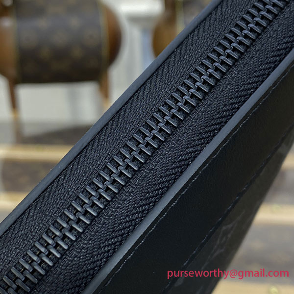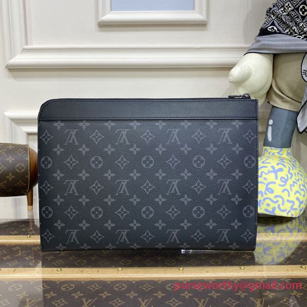 Roomy enough for a laptop, the Pochette Jour portfolio pouch is fashioned from Monogram Eclipse canvas with black-leather trim and black-color hardware. The L-zip opening gives easy access to belongings. The Pochette Jour can be carried as a clutch or used inside a larger bag.