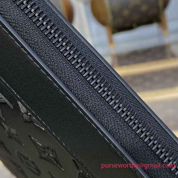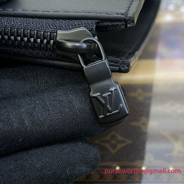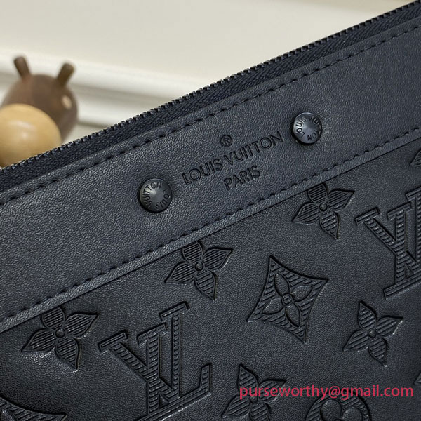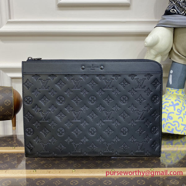 The handsome Pochette Jour is made from supple, black leather and accented with black-color hardware. The leather is embossed with the LVs and Monogram Flowers of the House’s classic Monogram pattern, bringing a luxurious feel to this versatile portfolio pouch. It can easily carry a laptop. 35 x 25 x 2.8 cm (Length x height x width ) Black Monogram Shadow embossed cowhide leather Cowhide-leather trim Textile lining Black-color hardware L-zip opening Inside flat pocket