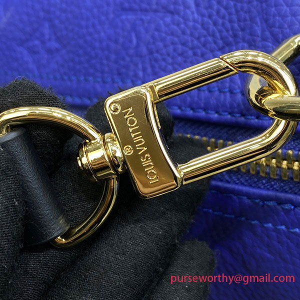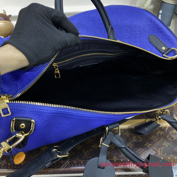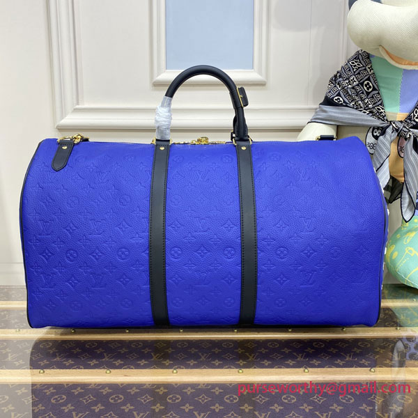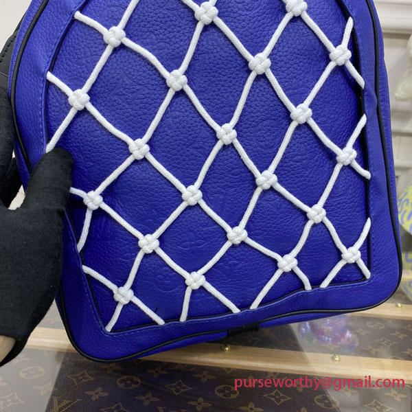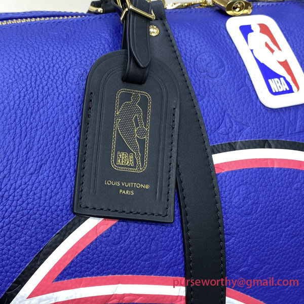 This Keepall Bandoulière 55 travel bag sports the colors of the NBA. Vivid blue Taurillon leather, embossed with the Monogram motif, is embellished with the House’s new LV Basketball logo and signed with the classic NBA patch. The ends of the bag feature basketball netting.