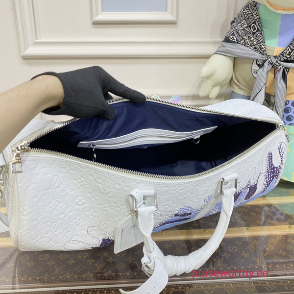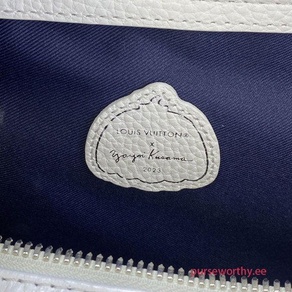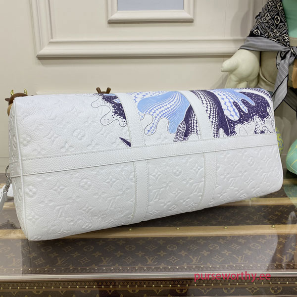 The LV x YK Keepall 50 bag was created as part of the inspired new Louis Vuitton x Yayoi Kusama Collection. Outside, it is embellished with one of the eminent Japanese artist’s best-known images dating from 1993, a psychedelic flower interlaced with her emblematic dots to symbolise the ephemeral nature of life and the infinity of time. Inside, it features an exclusive LV x YK signature, transforming a classic bag into an artistic collectsor’s item.