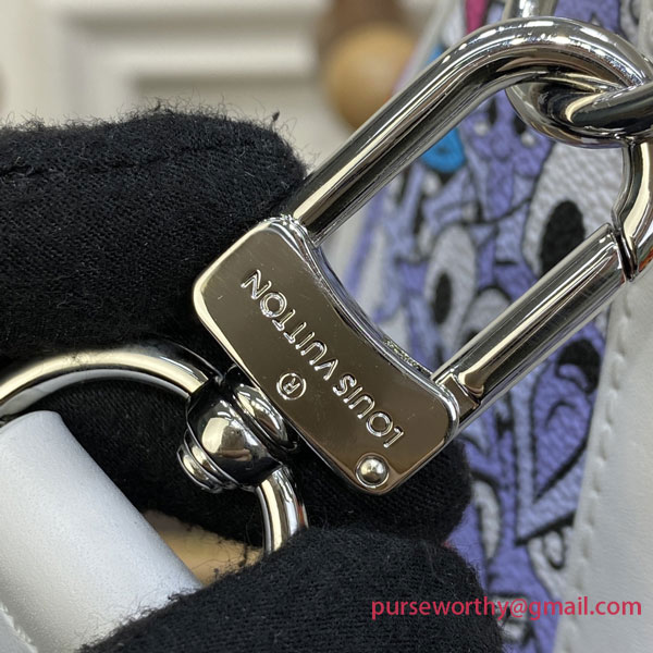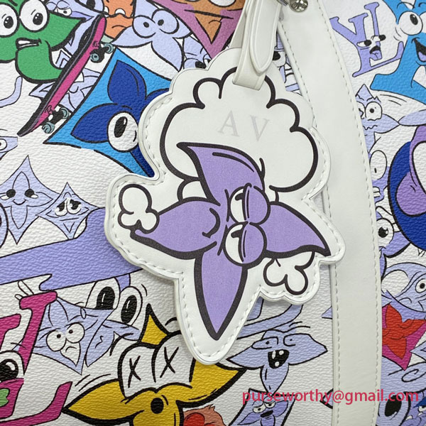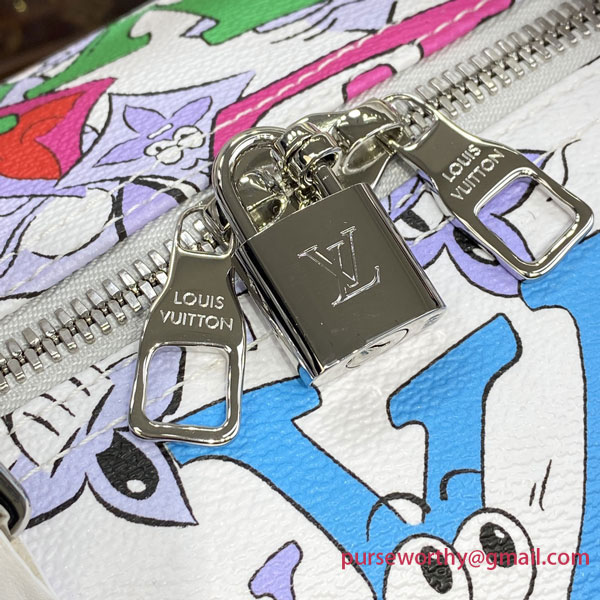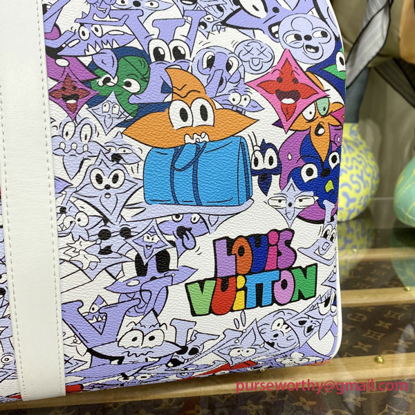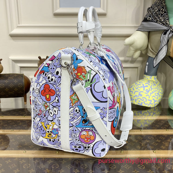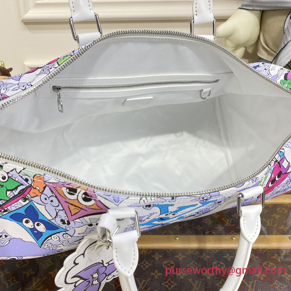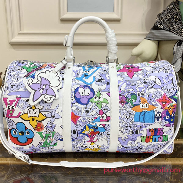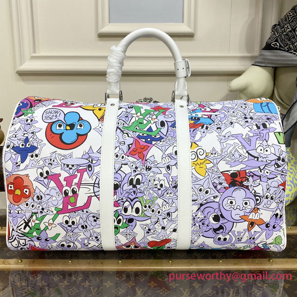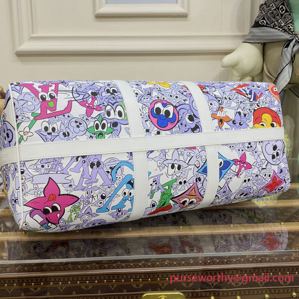 This Keepall Bandoulière 50 in canvas is adorned with a comic-book reimagining of the Monogram motif. Hundreds of characters, happy and sad, in the shape of Monogram Flowers and LVs adorn the bag. The top handles and lateral bands, in white leather, make it instantly recognizable as a Keepall. The cartoon name tag can be personalized.