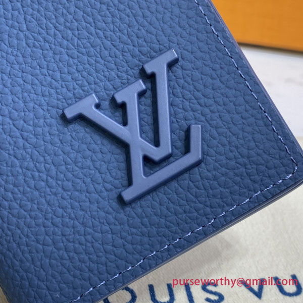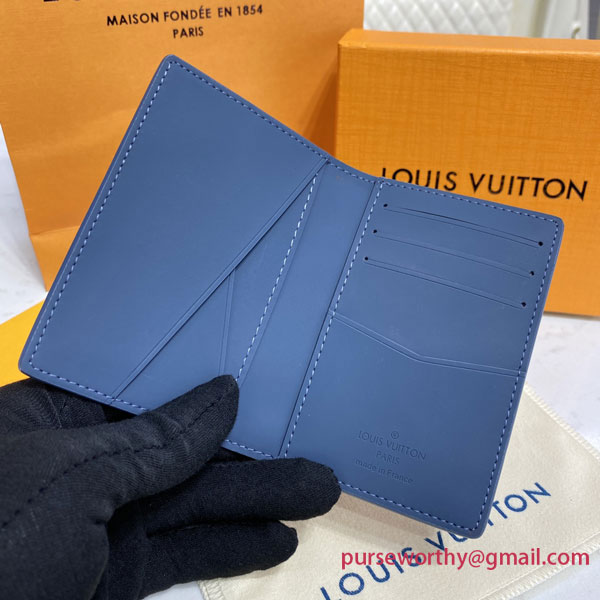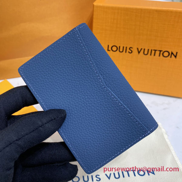 Louis Vuitton’s classic Pocket Organizer now comes in an ultra-contemporary shade of muted blue. Louis Vuitton’s distinctive Aerogram leather, fine and supple as an old-fashioned aerogram, is accented with the “LV” initials in tone-on-tone metal. And with six compartments plus three card slots, it has room for everything while fitting smoothly into a pocket.