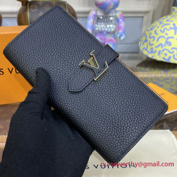 The LV Vertical wallet is an elegant design crafted from soft, grained Taurillon leather. It opens to reveal a contrasting lining, as well as eight card slots, a zipped coin pocket and a large, V-shaped slot for tickets and bills. This wallet features a distinctive sliding closure with an LV Initials accessory inspired by the iconic Capucines bag.