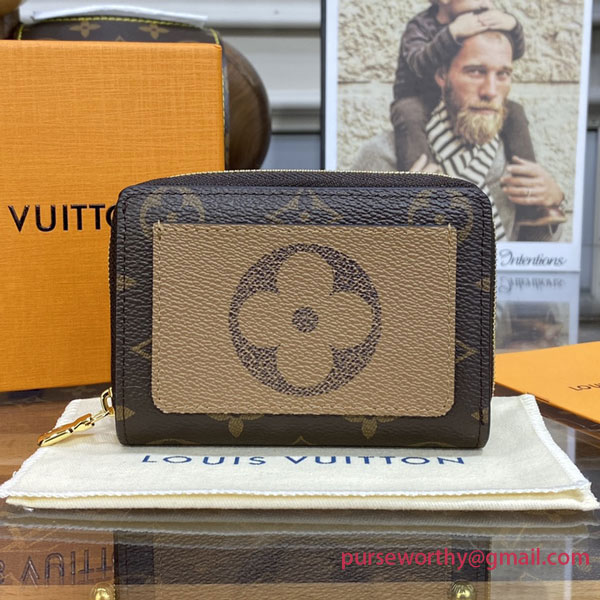 The Lou Wallet comes in Monogram canvas, with a contrasting front pocket featuring a Monogram Flower in Monogram Reverse canvas. This wallet is notable for its compact design and square shape. It opens to reveal a grained leather interior with six card slots and a note compartment as well as a zipped coin pocket on the side.