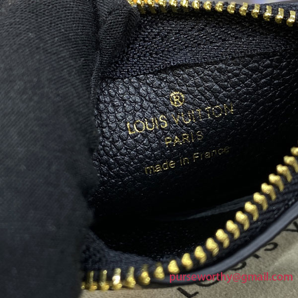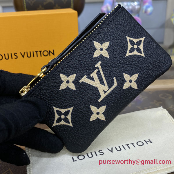 This edition of the Key Pouch is crafted from bicolor Monogram Empreinte leather. With its secure zip closure, this elegant and practical accessory can hold keys and other small items, such as coins, cards or lipstick. It can be hooked onto a bag or belt, or the D-ring inside many Louis Vuitton bags.