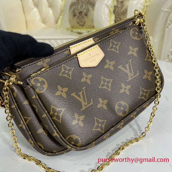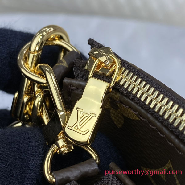 The Multi Pochette Accessoires is a hybrid cross-body bag with multiple pockets and compartments that brings together a Pochette Accessoires, a Mini Pochette Accessoires and a Round Coin Purse. Fashioned from Monogram canvas with a mini Monogram pattern on the sides of the two pochettes, it has both a removable gold-tone chain and an adjustable Louis Vuitton inscribed Jacquard strap for multiple carrying options.