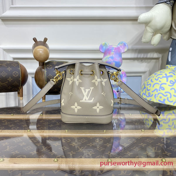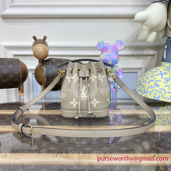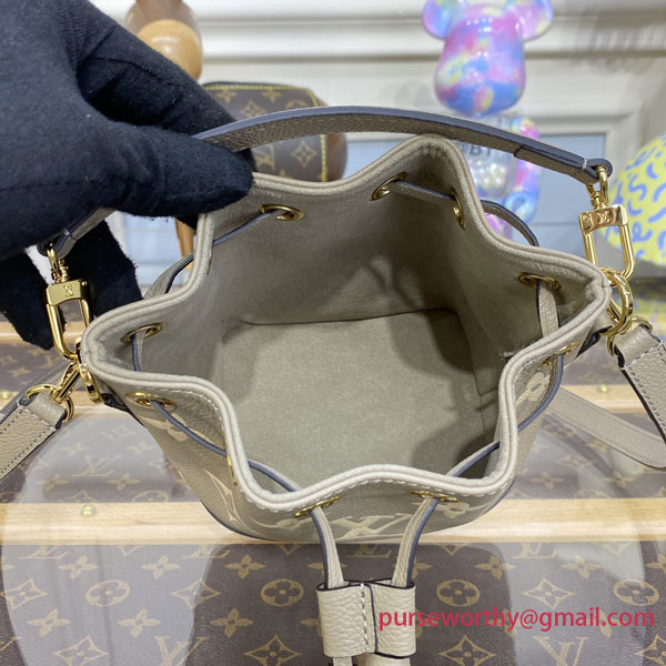 This bicolor version of the Nano Noé is crafted from supple Monogram Empreinte leather, embossed with the Monogram pattern. This miniature replica of the iconic Noé bag is a stylish way to carry everyday essentials. In addition to its practical drawstring closure, it features a removable handle and a removable, adjustable shoulder strap for different carry options.